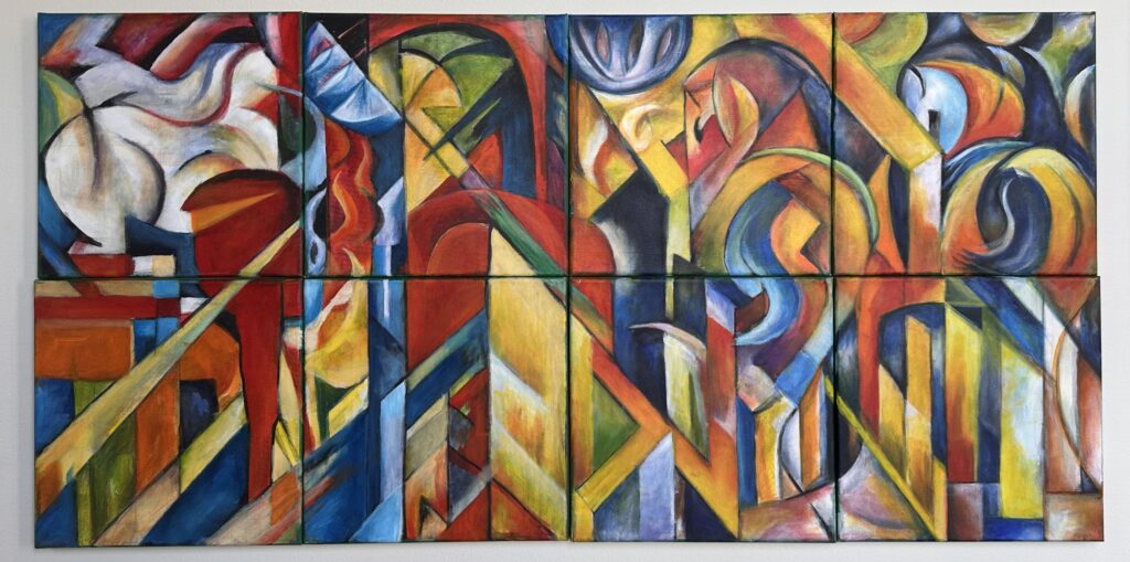 Seen together, the collection reveals a deeply intuitive and expressive practice. Fragmented planes, layered color, and joyful experimentation echo the lived experience of shedding expectation and becoming oneself.